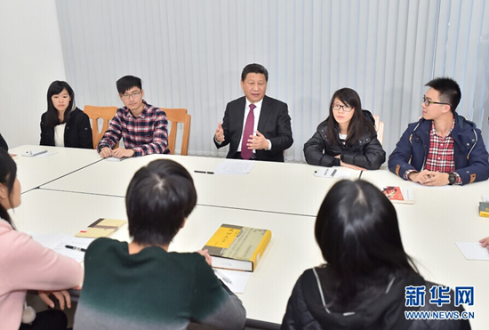 2014年12月20日下午,国家主席习近平来到澳门大学横琴新校区考察。这是习近平在郑裕彤住宿式书院参与学生举办的“中华传统文化与当代青年”主题沙龙。新华社记者 李涛摄