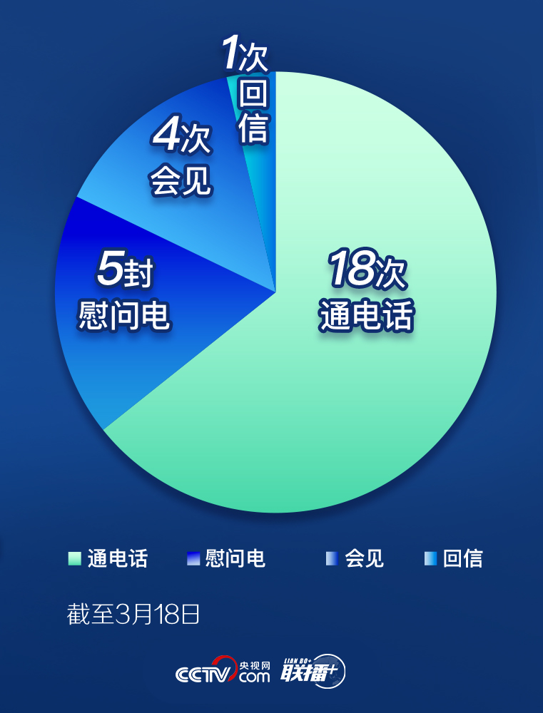 习近平从疫情发生至今,始终与外国国家元首、政府首脑以及国际和地区组织负责人保持沟通。截至3月18日,他在18通电话、5封慰问电、4次会见、1次回信等互动中,介绍中国疫情防控的举措、进展,表达休戚与共的中国情谊,传递战胜疫情的信心。