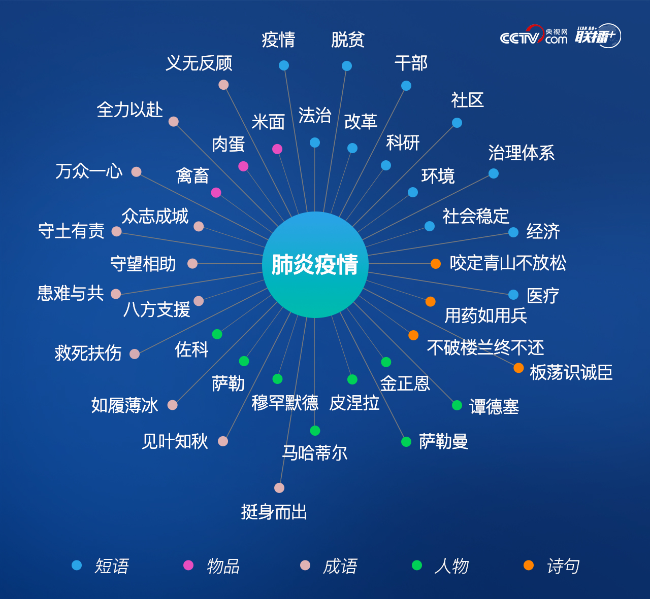 通过图谱对总书记的讲话内容按不同类别进行关联和细分,从中能看到此次疫情防控中不同切面和概貌。