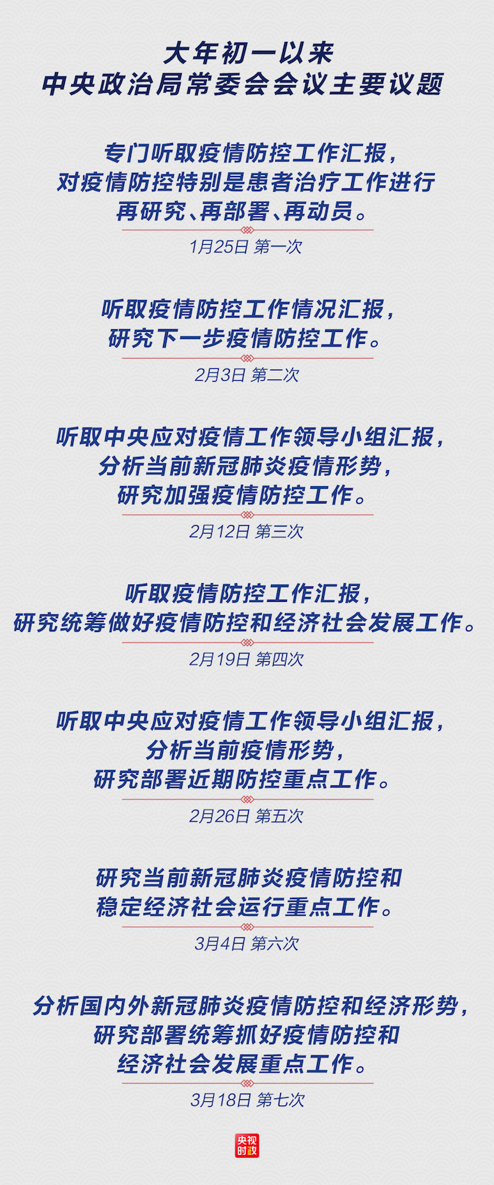 从1月25日(农历大年初一)开始,中央政治局常委会会议以平均不到8天一次的节奏召开。透过已经召开的7次会议,可以看到议题的变与不变。