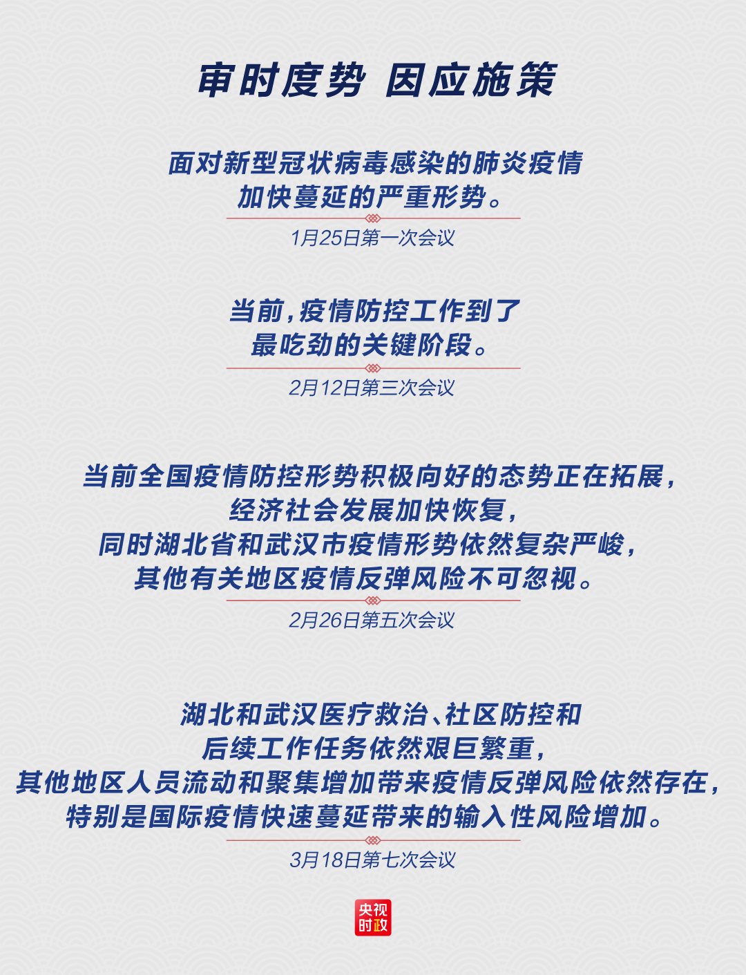 在3月18日的会议上,习近平指出,要准确把握国内外疫情防控和经济形势的阶段性变化,因时因势调整工作着力点和应对举措。这也是前后7次会议始终坚持的原则。