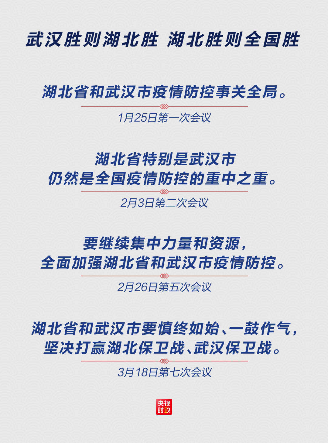 “加强疫情防控这根弦不能松,经济社会发展各项工作要抓紧。”“加强疫情防控必须慎终如始。”“毫不放松抓紧抓实抓细各项防控工作,决不能让来之不易的疫情防控持续向好形势发生逆转。”在前后7次会议上,习近平因应施策,把武汉和湖北作为全国主战场,对其他省份加强分类指导,始终主导着战“疫”的方向。