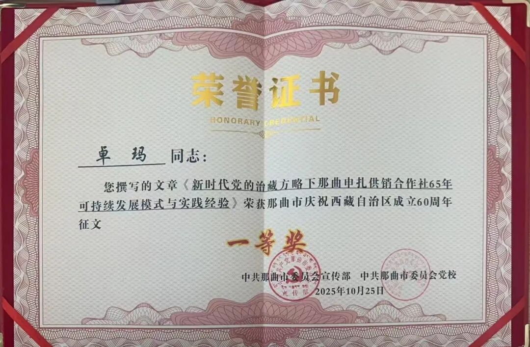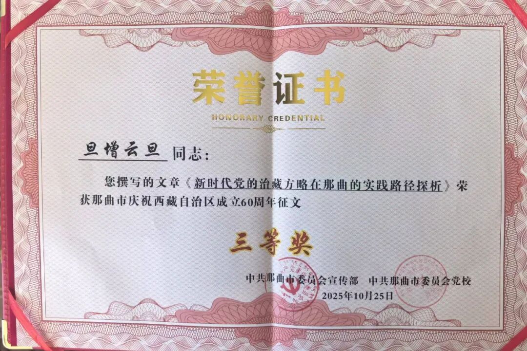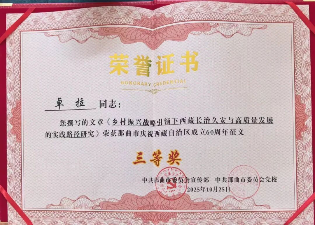 近日,那曲市委宣传部庆祝西藏自治区成立60周年征文研讨会活动评选结果正式揭晓,申扎县委党校卓玛、旦增云旦、卓拉老师撰写的征文《新时代党的治藏方略下那曲申扎供销合作社65年可持续发展模式与实践经验》《新时代党的治藏方略在那曲的实践路径探析》《乡村振兴战略引领下西藏长治久安与高质量发展的实践路径研究》,荣获那曲市庆祝西藏自治区成立60周年征文活动“一等奖”和“三等奖”。