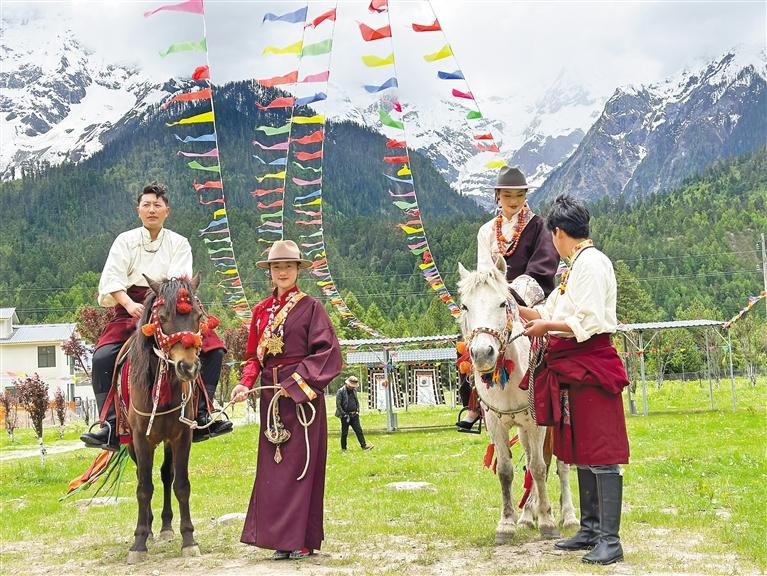 波密县扎木镇康木村坐落于318国道旁,风景秀丽,群山环绕,很多自驾游的游客都会经停于此体验藏家文化。 图为游客在康木村,穿着藏装体验骑马乐趣。