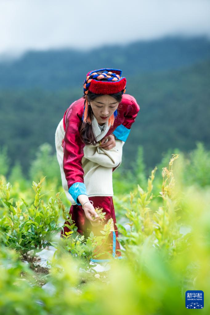 尼玛卓玛在田间采摘莓茶(7月29日摄)。新华社记者 旦增尼玛曲珠 摄