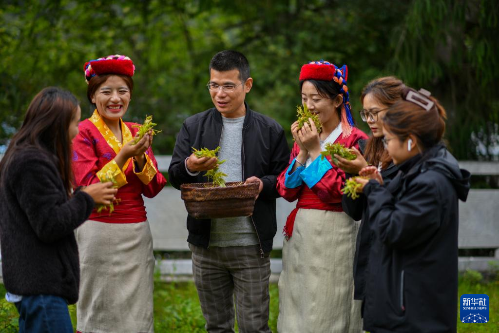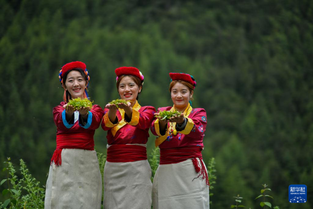 尼玛卓玛(左)与村民们在展示采摘到的莓茶(7月29日摄)。新华社记者 旦增尼玛曲珠 摄