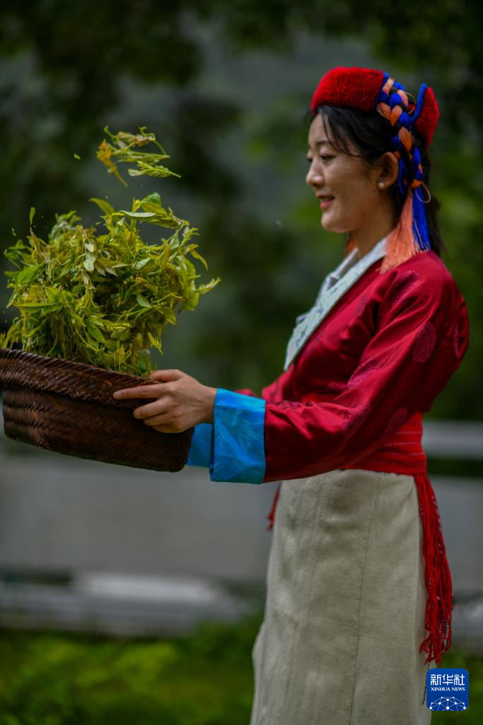 尼玛卓玛在处理采摘到的莓茶(7月29日摄)。新华社记者 姜帆 摄