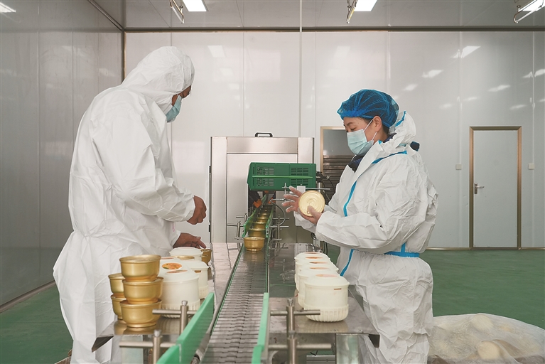 工人在检查藏香鸡罐装杀菌、包装一体化生产情况。