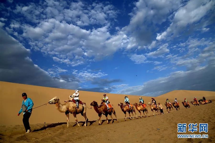▲游客在丝绸之路沿线旅游景点——甘肃省敦煌市鸣沙山月牙泉景区游览。 新华社发