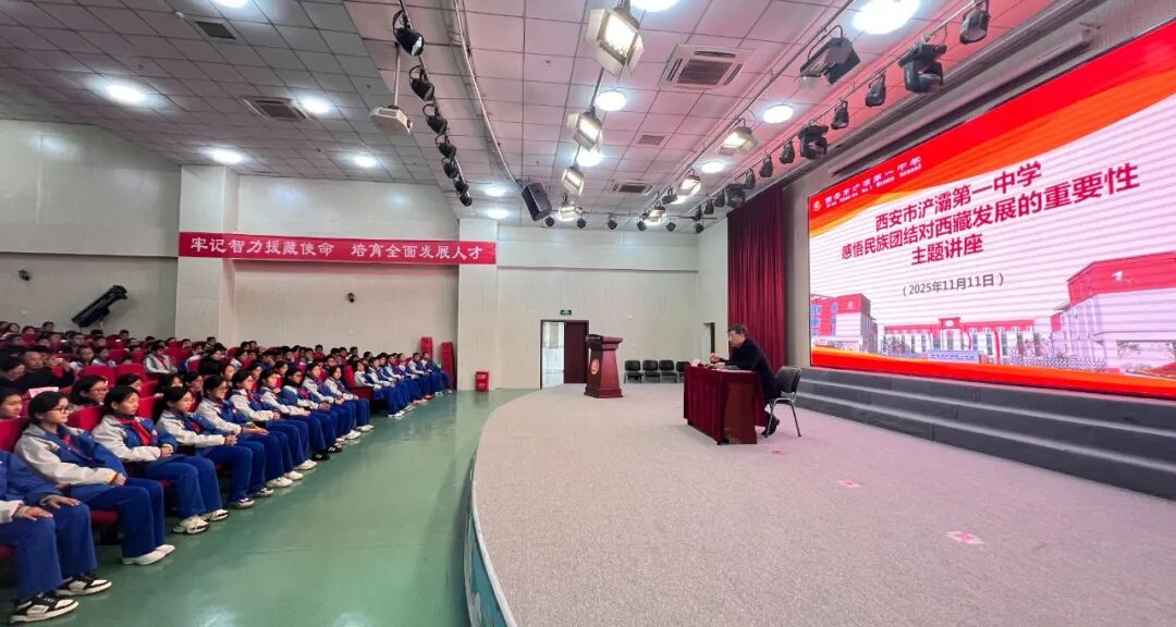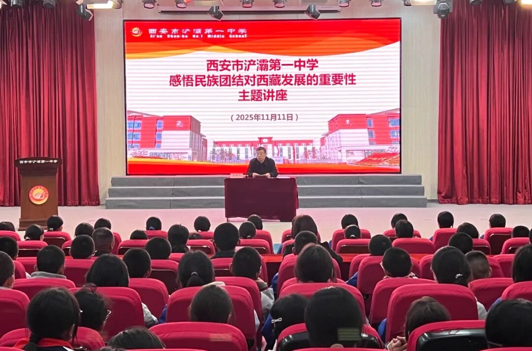 2025年11月11日,浐灞一中组织七、八年级西藏班学生参加了一场以“感悟民族团结、共筑美丽西藏”为主题的专题讲座。本次讲座特邀高学教授担任主讲,通过深入解读西藏发展的核心议题,引导学生深刻理解民族团结对西藏繁荣稳定的重要意义。