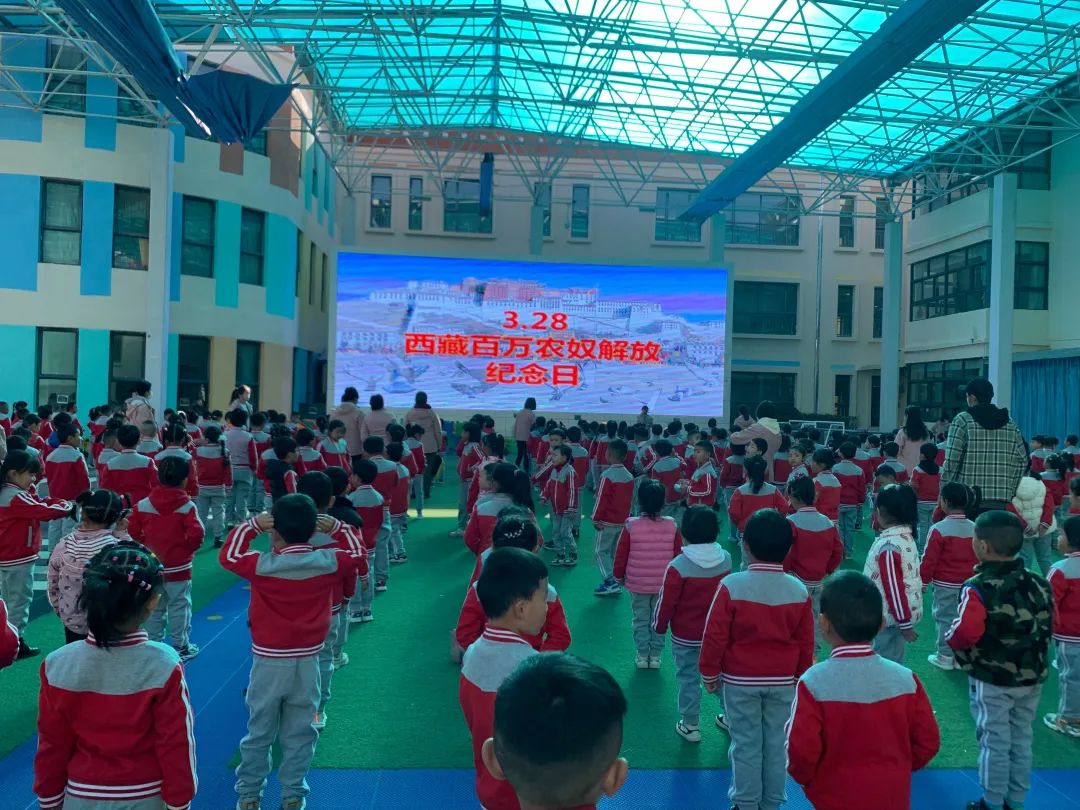西藏自治区实验幼儿园为庆祝“3·28”西藏百万农奴解放纪念日举行升旗仪式。