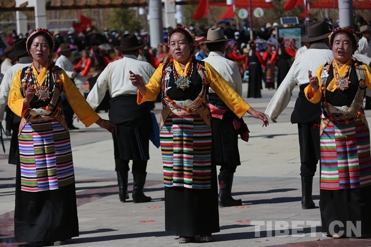 文艺演出结束后,现场响起欢快的锅庄舞曲,400余名日喀则各族群众跳起锅庄,以这种大联欢的形式,共同庆祝63年前摆脱苦难、重获新生,以及今天的幸福生活。