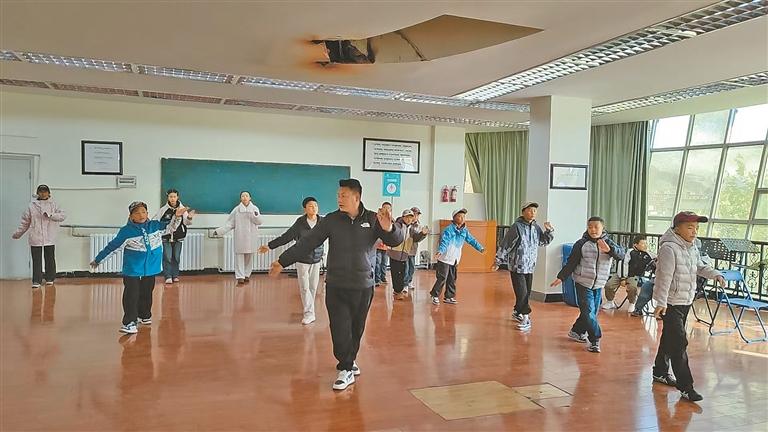 洛桑扎西在堆龙德庆区青少年活动中心,为即将前往北京参赛的少儿藏戏班学生指导动作。