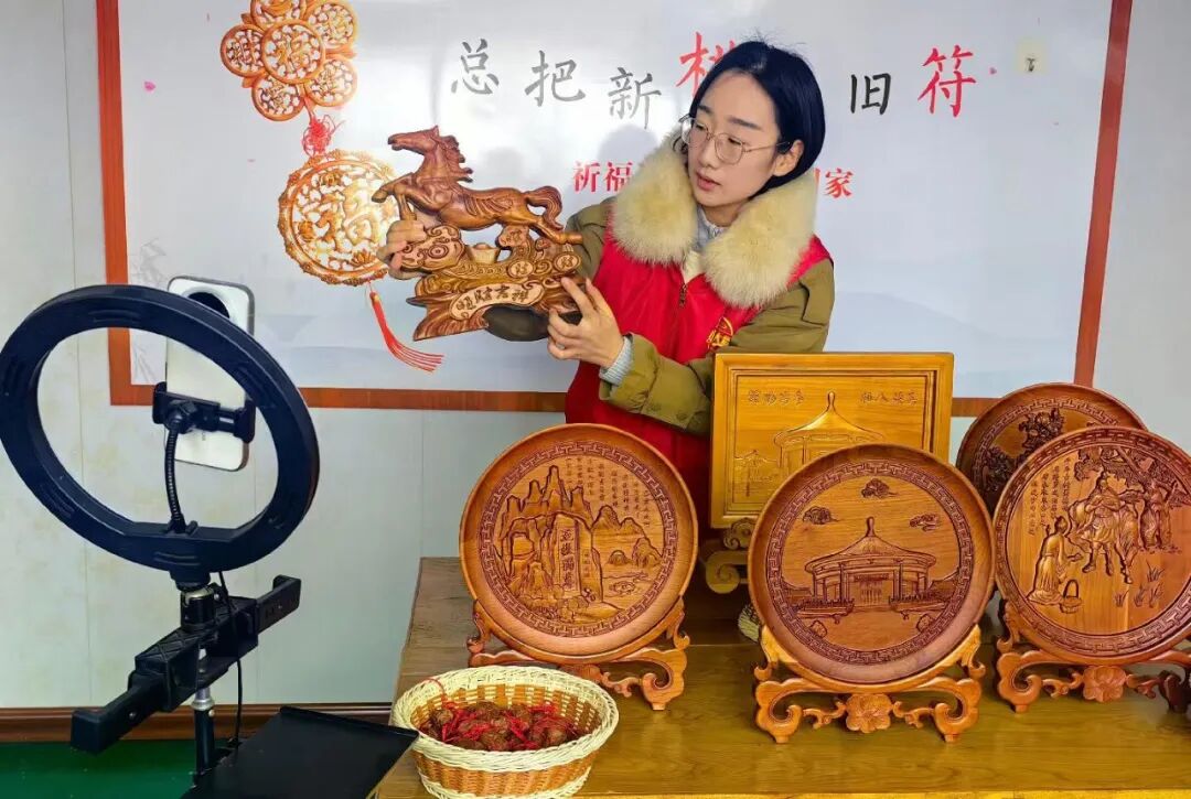 “桃木工艺品”直播间里主播推介马年生肖桃符工艺品。 庆云县委宣传部供图