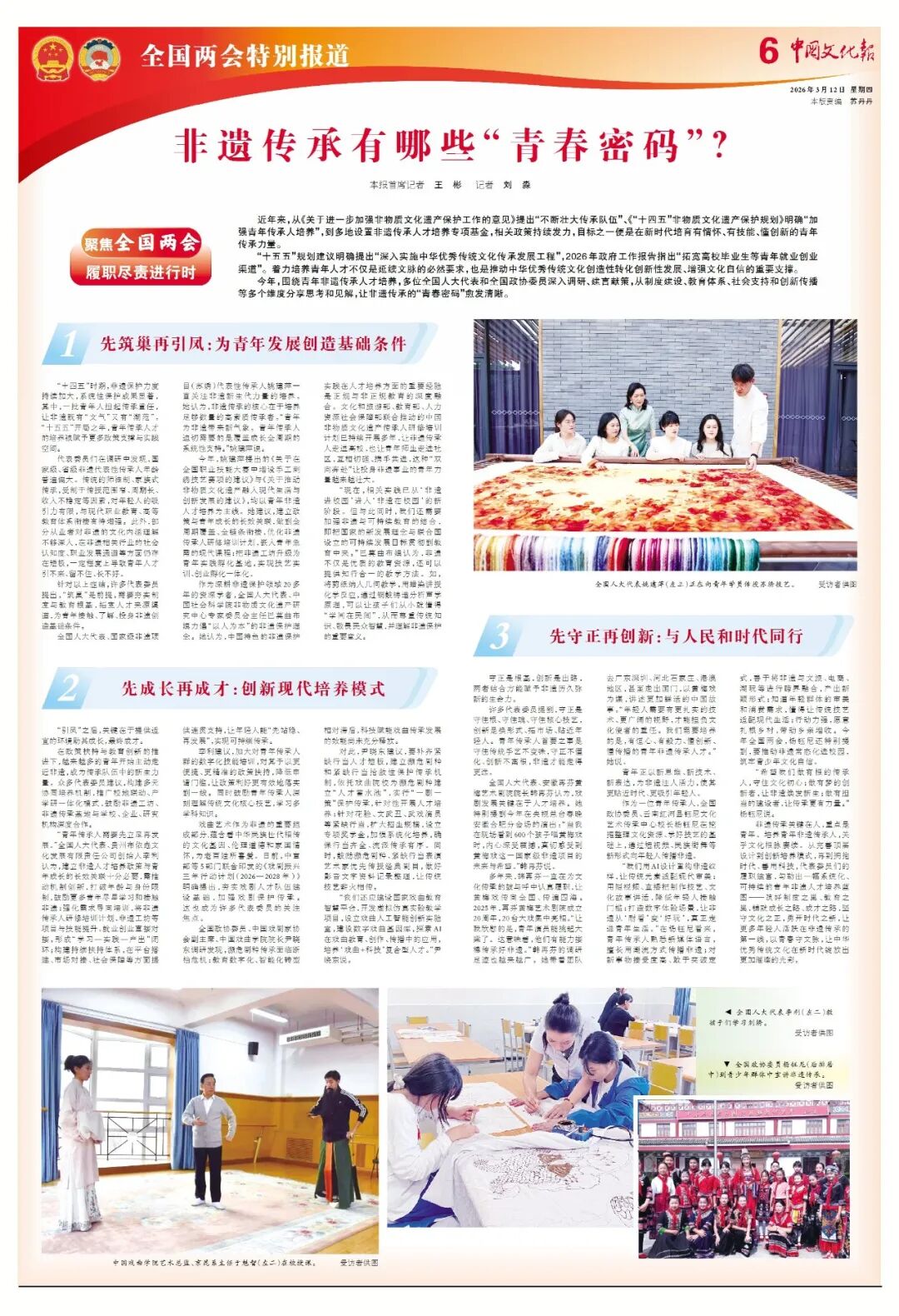 今年,围绕青年非遗传承人才培养,多位全国人大代表和全国政协委员深入调研、建言献策,从制度建设、教育体系、社会支持和创新传播等多个维度分享思考和见解,让非遗传承的“青春密码”愈发清晰。