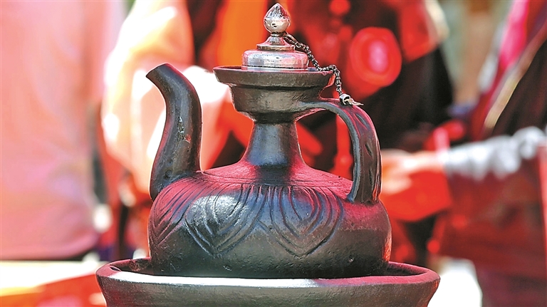 察雅黑陶与其他陶罐的最大区别除了原材料的选取外,还体现在独特的制作工艺上。传统黑陶多为简约的罐、壶、碗等形制,图案以简单的弦纹、水波纹为主,体现了藏族文化中“崇尚自然、简约质朴”的审美。“在新时代,传统技艺要想走进年轻人的生活,必须在设计上大胆创新。”曲珠说,为此,他结合现代生活需求与审美趋势,对黑陶的外形、图案进行了大胆改良。